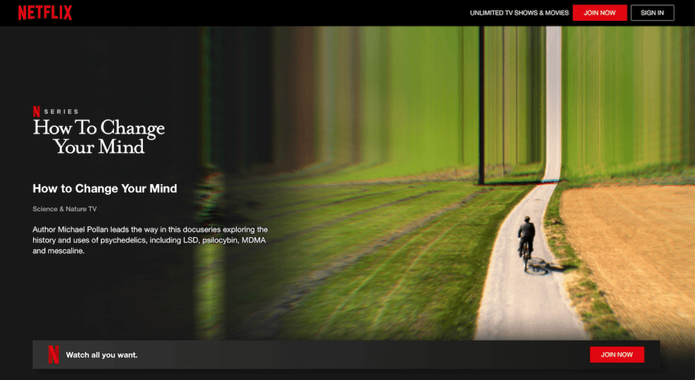 As Netflix says “Academy Award-winning filmmaker Alex Gibney and New York Times best-selling author Michael Pollan present this documentary series event in four parts, each focused on a different mind-altering substance: LSD, psilocybin, MDMA, and mescaline.”